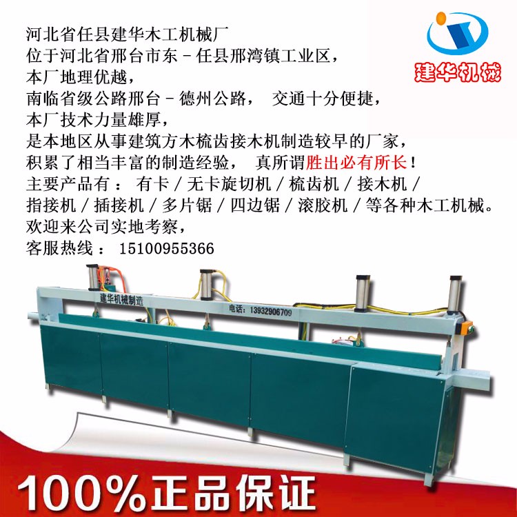 用途:本機床是集成材料生產(chǎn)線的重要設(shè)備之一,它的作用是:將已開好榫槽準(zhǔn)備上膠的短木料,縱向接成為長料,可提高木料的利用和提高木料的品質(zhì)。