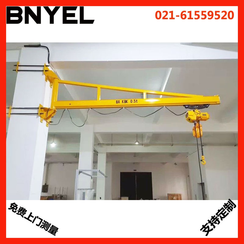 墻壁式旋臂起重機(又稱:壁柱式懸臂起重機,壁柱式懸臂吊,壁柱式旋臂吊,墻壁吊,墻壁式懸臂起重機)是彬野起重公司參照進口設(shè)備研制的新產(chǎn)品,根據(jù)用戶需要設(shè)計的專用起重設(shè)備。具有結(jié)構(gòu)新穎、合理、簡單、操作使用方便、回轉(zhuǎn)靈活、自重輕、載荷移動靈活等優(yōu)點,是節(jié)能的物料吊運裝備??蓮V泛利用于廠礦、車間的生產(chǎn)線、裝配線和機床的上下活及倉庫、碼頭等場合的重物吊運。墻壁式旋臂起重機(墻壁吊)由支架、旋臂裝置及環(huán)鏈電動葫蘆等組成。懸臂固定在墻壁或水泥柱上,可根據(jù)用戶需求進行回轉(zhuǎn)?;剞D(zhuǎn)部分分為手動回轉(zhuǎn)和電動回轉(zhuǎn)。環(huán)鏈電動葫蘆安裝在懸臂軌道上,用于起吊重物。結(jié)構(gòu)及操作本機主要由1、懸臂2、回轉(zhuǎn)裝置3、環(huán)鏈電動葫蘆組成。環(huán)鏈電動葫蘆有起重和在橫梁上往復(fù)運行的功能。懸臂梁可由回轉(zhuǎn)裝置上的的減速機帶動滾輪進行回轉(zhuǎn)運動。電器部分見附圖:電氣原理幾電氣接線圖。電器控制箱安裝在環(huán)鏈葫蘆上。