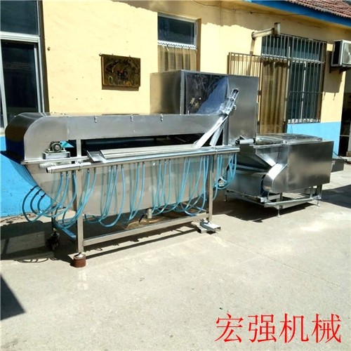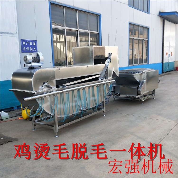 宏強(qiáng)雞用燙毛脫毛一體機(jī),這是一款全自動(dòng)的燙毛脫毛一體機(jī)。只要將殺好的雞投入投雞口就可以了,下面的步驟就不用人工操作了。設(shè)備的采用鏈條轉(zhuǎn)動(dòng),可以調(diào)節(jié)速度,鏈條轉(zhuǎn)的越快,燙毛的時(shí)間也就越短。設(shè)備先經(jīng)過瀝血,這個(gè)有一個(gè)接血板,雞血是可以收集的。下一步是進(jìn)行燙毛,燙池30秒開門一次,一次可以有5-6只雞一起進(jìn)入脫毛機(jī),整個(gè)的過程是不用人工控制的,脫毛的時(shí)間在25-30秒左右,脫毛完成后自動(dòng)出來。