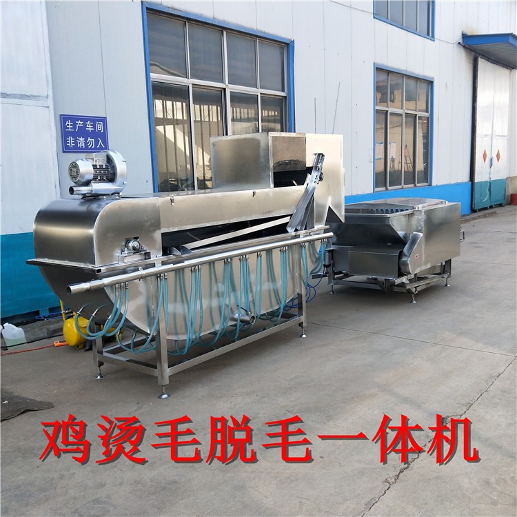 雞用船式燙毛脫毛一體機,這是一款全自動的燙毛脫毛機,設(shè)備能夠自動燙毛、自動脫毛。整個的過程不需要人工,有效的節(jié)省了人力。設(shè)備的主體為船狀,整機采用的是201不銹鋼,不容易生銹,有效的減少因為生銹帶來的產(chǎn)品污染,保證了產(chǎn)品的質(zhì)量。設(shè)備的操作簡單,只要將殺好的雞放進投雞口就好了,放進去后先進行瀝血,瀝血的下面有接血板,雞血是可以手機起來的,瀝血之后,通過鏈板傳送至燙池,這個通過鏈板的轉(zhuǎn)速來控制浸燙的時間,鏈板轉(zhuǎn)的越快,浸燙的時間越短。燙池30秒開門一次,一次有5、6只雞一起進入脫毛機。
