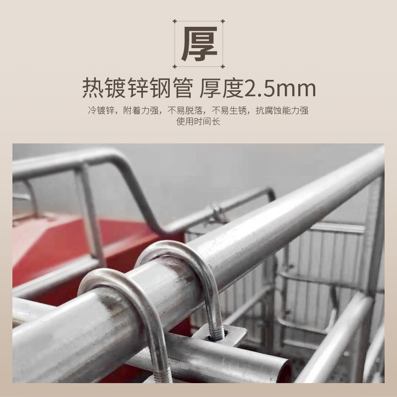 >>母豬產(chǎn)床能夠有效的節(jié)省占地空間,較大限度的將有限建筑面積利用起來(lái),同時(shí)更易于對(duì)妊娠母豬的管理,熱鍍鋅鋼管焊接,堅(jiān)固耐用,耐腐蝕、好清洗。