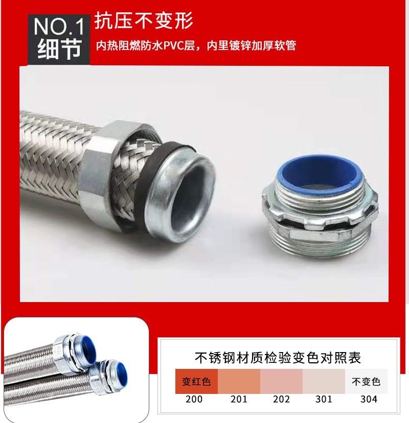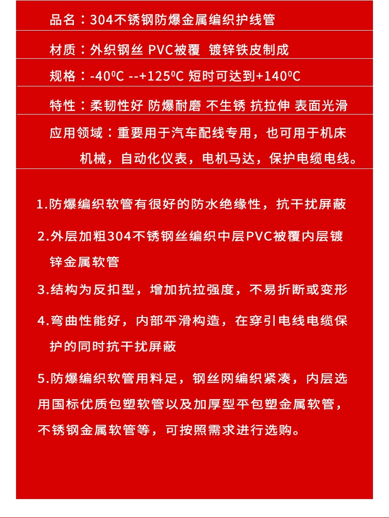 1.編織金屬防爆管結構:外層加粗304不銹鋼編織中層PVC被覆內層鍍鋅金屬軟管,所以也稱之為304編織金屬防爆管。