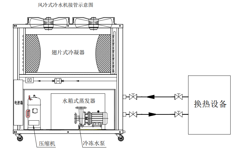 2、選擇合適管徑的水管,機(jī)組最大功率運(yùn)行時的冷卻系統(tǒng)及冷水系統(tǒng),并正確連接。