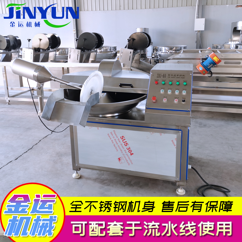 工作效率高,衛(wèi)生,結(jié)構(gòu)合理,操作簡(jiǎn)單,實(shí)用范圍廣??蓪?duì)肉類,果菜蔬,海產(chǎn)品及調(diào)味品,進(jìn)行深加工(如縻狀,塊狀),是肉類加工生產(chǎn)中一個(gè)關(guān)鍵設(shè)備。斬刀高速旋轉(zhuǎn),可以縮短運(yùn)行時(shí)間,減少物料發(fā)熱量,保持餡料的色澤,彈性、出品率和產(chǎn)品的保質(zhì)期。
