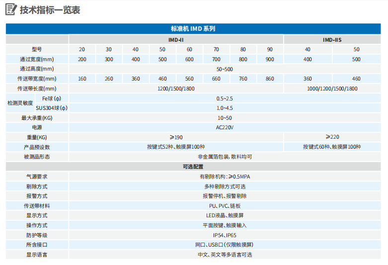 標(biāo)準(zhǔn)款金屬檢測機(jī)IMD系列基于 II 代機(jī),新增雙路檢測、高低頻切換等功能, 對設(shè)備檢測性能、適應(yīng)能力均有提高,針對種類較多、差異性較大的產(chǎn)品,能夠更換不同頻率檢測, 提升檢測效果。面板采用雙排 LED 燈 帶,簡潔美觀。
