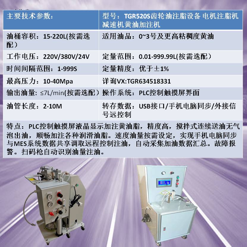 減速機定量黃油加注機TGR520S用雙氣缸壓油升降機給桶內(nèi)油脂加壓,使桶內(nèi)油脂不抽空,能及時擠壓到泵油脂口,實時計量準,重復性好,液晶顯示人機操作界面,注脂設備僅需通過轉(zhuǎn)換閥的操作實現(xiàn)升降機升降可以方便快捷地進行油桶更換。