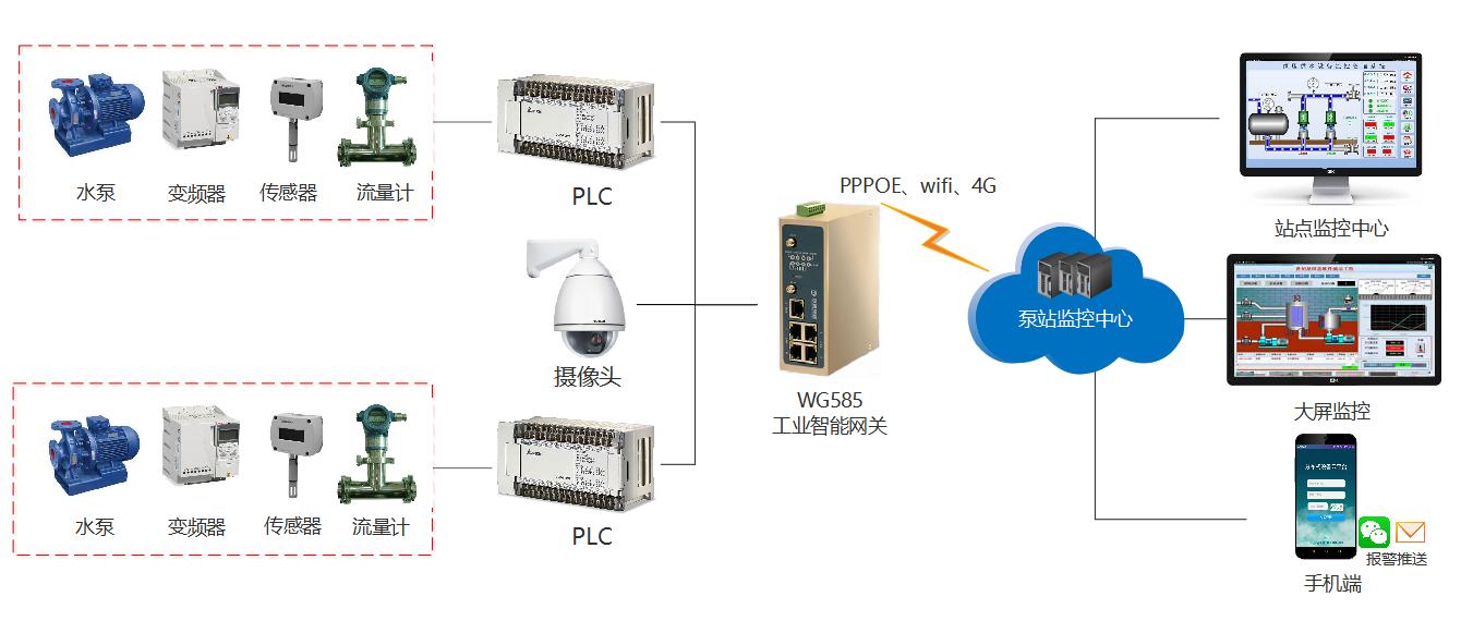 物通博聯(lián)WG585智能網(wǎng)關(guān)通過網(wǎng)口或串口與PLC連接,采集泵的運(yùn)行狀態(tài),水位,壓力,流量等信號(hào)以及攝像頭,通過4G/有線/WiFi方式上網(wǎng),將數(shù)據(jù)傳到泵站監(jiān)控中心(可以是物通博聯(lián)云平臺(tái)也可以是第三方云平臺(tái)),泵站管理人員可以在泵站監(jiān)控中心遠(yuǎn)程監(jiān)測站內(nèi)水位或壓力、泵組工作狀態(tài)、出站流量、出站壓力等;支持泵啟動(dòng)設(shè)備手動(dòng)控制、自動(dòng)控制、遠(yuǎn)程控制泵組的啟停,同時(shí)通過電腦端或手機(jī)端云組態(tài)監(jiān)控,遠(yuǎn)程修改泵站PLC的程序,實(shí)現(xiàn)泵站無人值守。產(chǎn)生故障會(huì)以短信或微信推送給相應(yīng)的運(yùn)維人員。