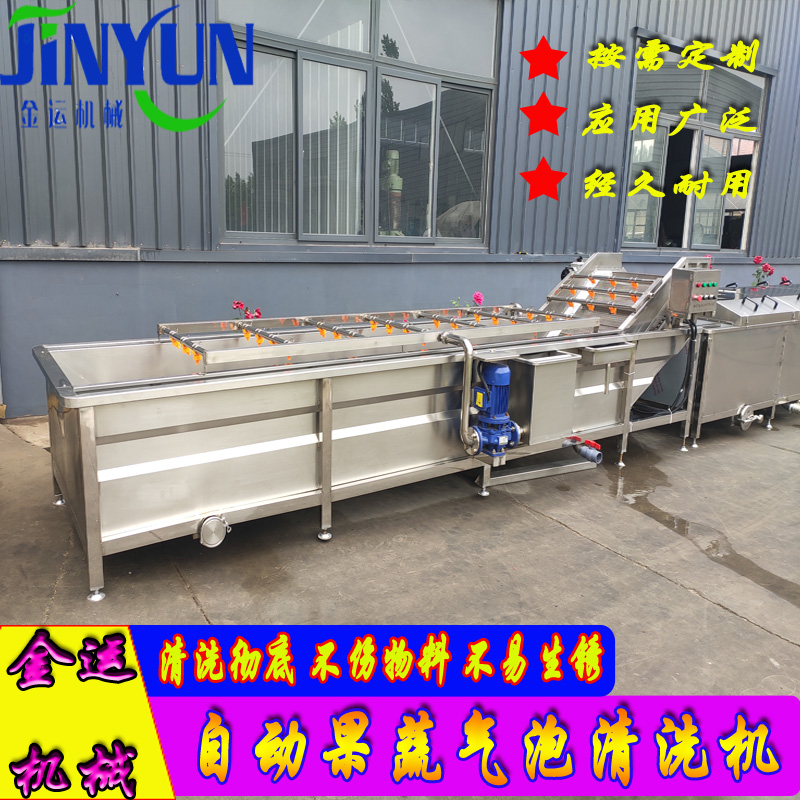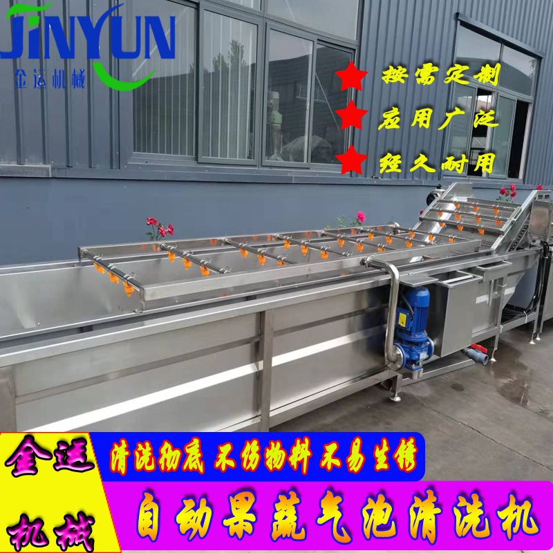 果蔬氣泡清洗機(jī)是針對果蔬深加工而研發(fā)的一款果蔬清洗設(shè)備,設(shè)備利用氣泡發(fā)生裝置產(chǎn)生氣泡使水翻涌在沖擊物料表面泥污的同時減少物料之間的摩擦,在清洗的同時使其達(dá)到保護(hù)物料表皮的作用,噴淋裝置配合二次清洗,沖洗物料泥污殘?jiān)锪锨逑催^程中不銹鋼輸送鏈傳送物料,設(shè)備實(shí)現(xiàn)自動化連續(xù)性作業(yè)。