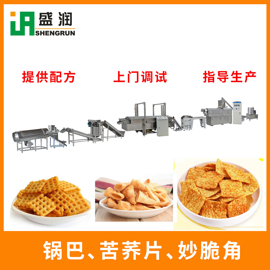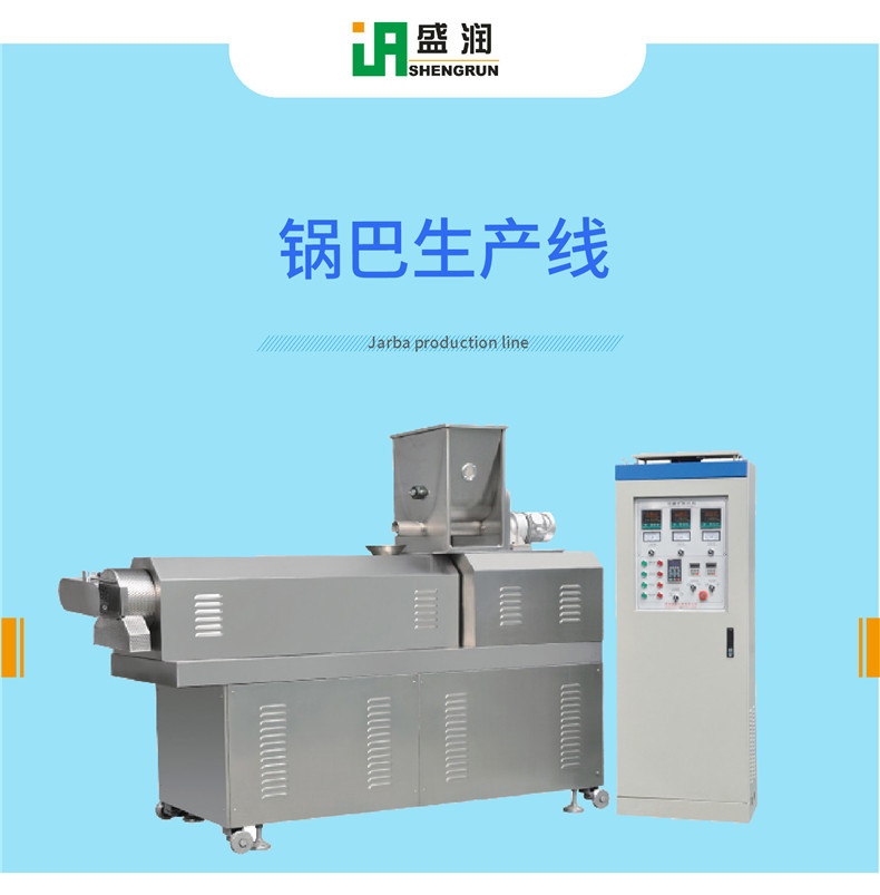2、膨化機:通過擠壓膨化生產(chǎn)出長條狀的鍋巴片,更換模具可以寬窄厚薄不等的鍋巴。