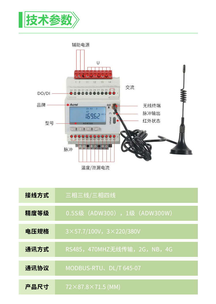 ADW300無線計量儀表主要用于計量低壓網(wǎng)絡的三相有功電能,具有RS485通訊和470MHz無線通訊功能,方便用戶進行用電監(jiān)測、集抄和管理。可靈活安裝于配電箱內(nèi),實現(xiàn)對不同區(qū)域和不同負荷的分項電能計量,統(tǒng)計和分析。