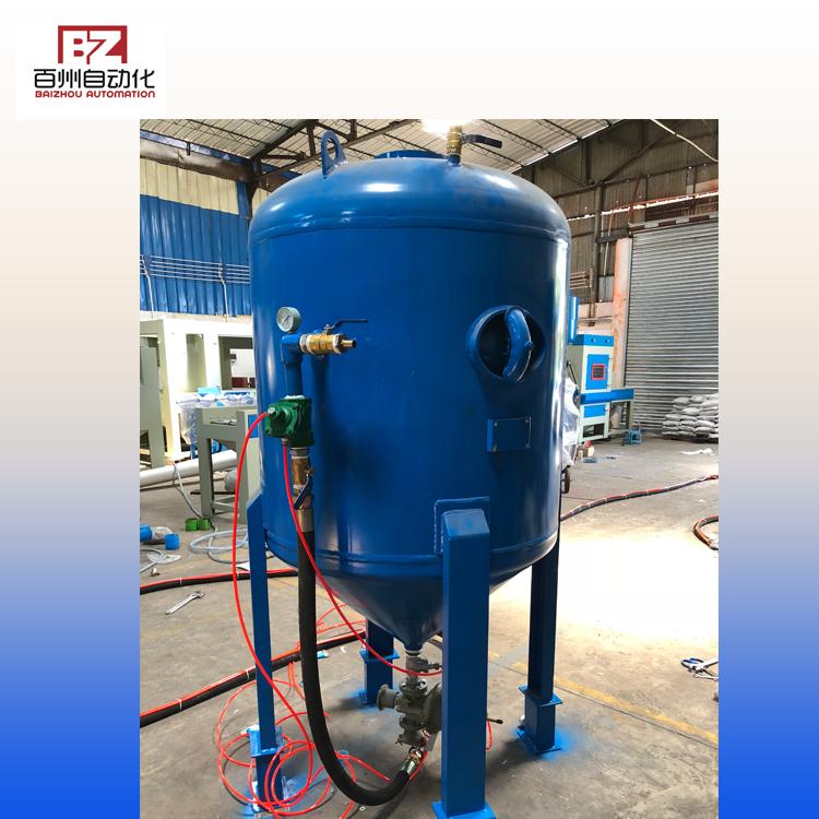 本機采用壓送式噴砂(噴丸)機構(gòu),即利用壓縮空氣在高壓罐內(nèi)高速流動行成高壓作用,將高壓罐內(nèi)的砂料通過輸砂管噴出,然后隨壓縮氣流由噴槍嘴高速噴射到工件表面,達到噴砂加工的目的。