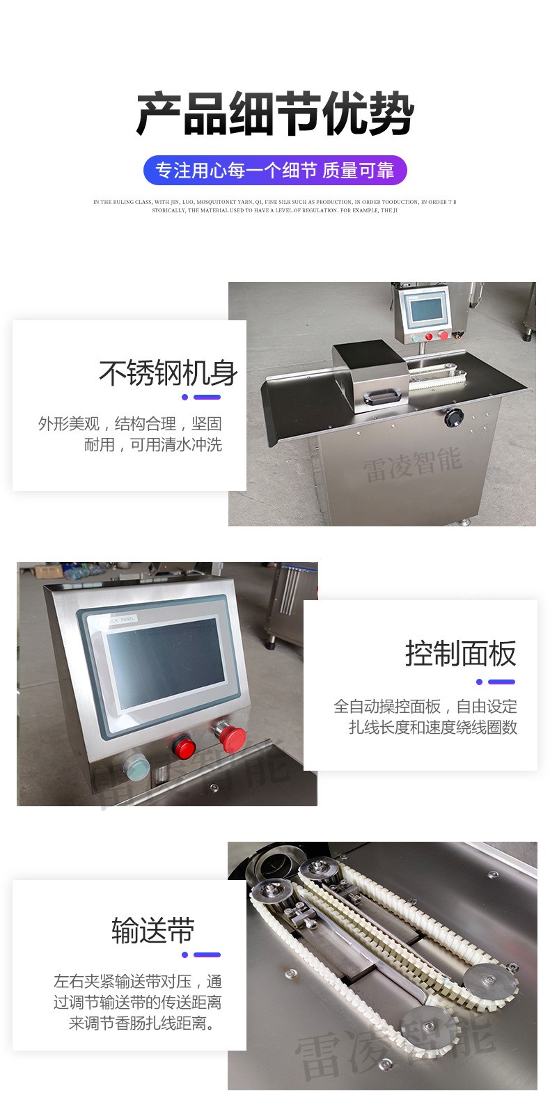 全自動單路香腸扎線機采用了先進的進口伺服電機和本公司較新研制的人機界面控制系統(tǒng),具有效率高、易操控、節(jié)約生產(chǎn)原料等優(yōu)點,產(chǎn)品的長度與直徑可以根據(jù)客戶的要求自主設(shè)定。適用于臺灣熱狗腸、臺式烤腸、脆皮腸、早餐腸、雞肉腸、歐式烤腸.扎線機,產(chǎn)品長度的調(diào)節(jié)可以隨心所欲。該香腸扎線機機械的優(yōu)點是節(jié)約腸衣。并且線扎的產(chǎn)品不用人工和機械剪節(jié),相對扭結(jié)可節(jié)約人工3人以上和對剪節(jié)設(shè)備的投入,可結(jié)扎羊腸衣,豬腸衣,蛋白腸衣,塑料腸衣等,是香腸尤其是速凍臺灣烤腸、親親腸生產(chǎn)定量、結(jié)扎的理想設(shè)備。 咨詢:130--0278**8350