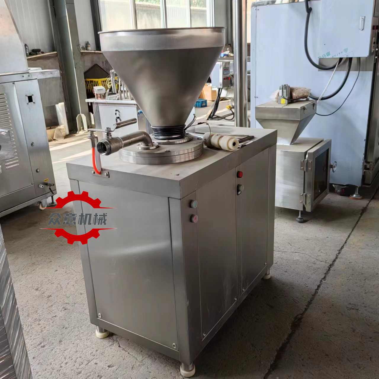 灌腸機(jī)是一款采用液壓,氣壓原理,將肉料灌注進(jìn)腸衣內(nèi)的設(shè)備??蛇B續(xù)自動(dòng)定量灌腸制,操作簡(jiǎn)單,附帶調(diào)速,腳踏開關(guān)控制系統(tǒng)功能,維修方便,準(zhǔn)確性高,重復(fù)性好,是一種效率高,易操作的理想產(chǎn)品。整機(jī)采用優(yōu)良不銹鋼制成,外型美觀,結(jié)構(gòu)緊湊合理,密閉防水,易于清洗。灌腸機(jī)廣泛適用各種腸類制品的灌制。尤其對(duì)較干的料餡相對(duì)其他灌腸機(jī)效率更佳。該機(jī)上部設(shè)有貯料斗、碟形閥,可實(shí)現(xiàn)不掀蓋連續(xù)灌制,提高了工作效率。