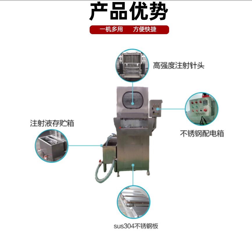 6.可帶骨注射(設有自動保護裝置,當注射針碰到硬物時,注射針隨之抬起,不受損壞;注射針可方便調(diào)節(jié)安裝)。注射針設計DU特、排列合理,料水可均勻分布在肉塊中,注射率可調(diào).