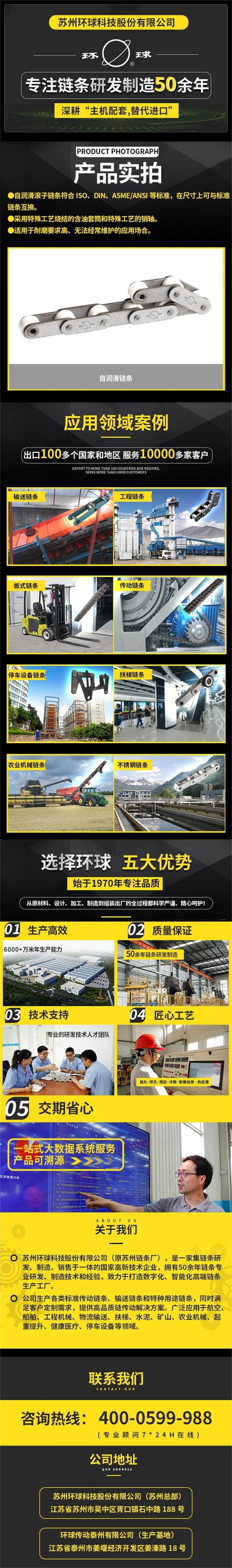 環(huán)球傳動(dòng)(原蘇州農(nóng)機(jī)配件廠)始建于1970年,是一家集鏈條、軸承和智能系統(tǒng)研發(fā)、制造、銷售于一體的國(guó)家高新技術(shù)企業(yè),擁有國(guó)家認(rèn)定企業(yè)技術(shù)中心,是中國(guó)鏈傳動(dòng)行業(yè)重點(diǎn)骨干企業(yè)和專精特示范企業(yè)。擁有50年鏈條專業(yè)研發(fā)、制造技術(shù)和生產(chǎn)經(jīng)驗(yàn),致力于打造數(shù)字化、智能化的高端鏈條生產(chǎn)基地。