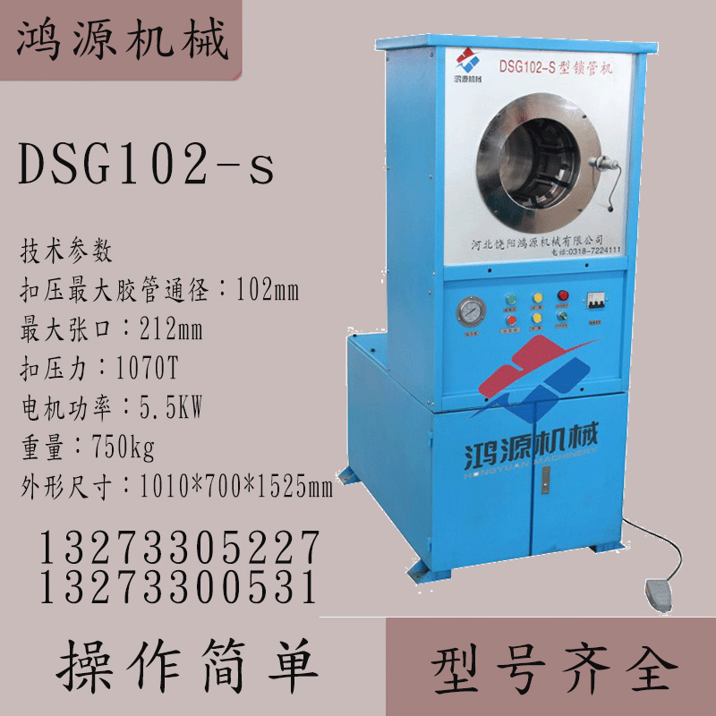 我廠生產(chǎn)的DSG-102/S型鎖管機(jī)適用于工農(nóng)業(yè)和工程機(jī)械液壓傳動(dòng)用高壓膠管、纖維管、塑料管、復(fù)合管總成的扣壓加工。采用NC控制,可點(diǎn)動(dòng)、自動(dòng)、半自動(dòng)、延時(shí)保壓、保壓時(shí)間可調(diào)、多段扣壓功能,油缸采用環(huán)形結(jié)構(gòu),可雙向進(jìn)料進(jìn)行扣壓,具有體積小、重量輕、功能多、開???、易操作、好維修等優(yōu)點(diǎn)