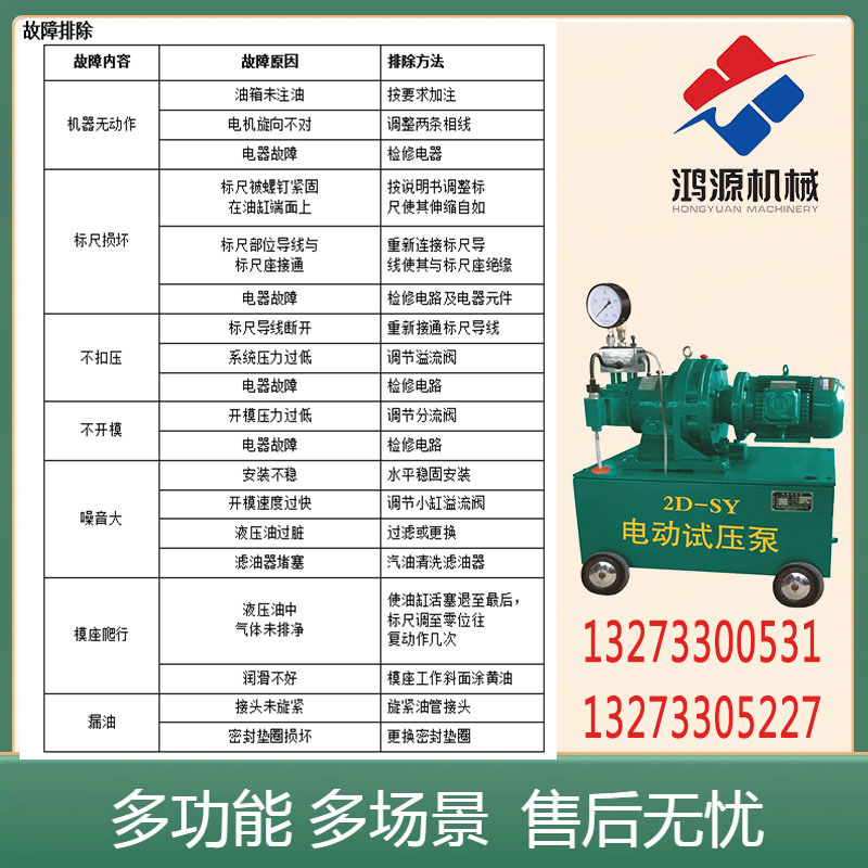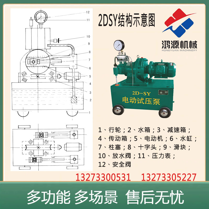 2D-SY50/100、2D-SY40/130型電動(dòng)試壓泵是電動(dòng)雙缸往復(fù)移動(dòng)式試壓泵,主要是對(duì)壓力容器、化工設(shè)備、壓力儀表、管道閥門(mén)等做水壓、密封、強(qiáng)度和爆破試驗(yàn),及實(shí)驗(yàn)室獲得高壓液體。實(shí)驗(yàn)介質(zhì)為水、運(yùn)動(dòng)粘度≤45mm2/s油類(lèi),或類(lèi)似于水、油的液體。