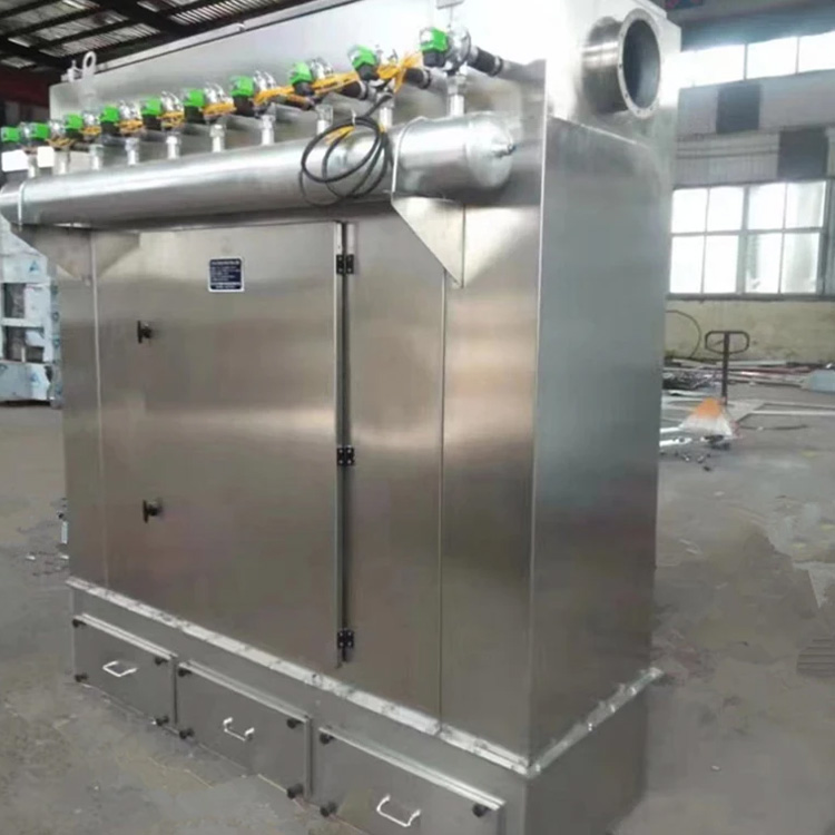 3、脈沖清灰系統(tǒng):脈沖清灰系統(tǒng)是不銹鋼脈沖除塵器的重要組成部分,用于清理濾袋上的積灰。該系統(tǒng)通常由脈沖閥、氣包、噴吹管等部件組成。當(dāng)濾袋阻力增大到額定程度時(shí),脈沖閥被觸發(fā),高壓氣流通過噴吹管噴向?yàn)V袋內(nèi)部,使濾袋急劇膨脹并抖落積灰。這種清灰方式有效且不會(huì)對濾袋造成損壞,同時(shí)結(jié)構(gòu)也相對簡單。