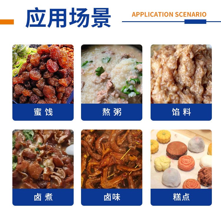 適應(yīng)于各種高粘度醬料的攪拌加熱蒸煮炒制:焙烤餡料炒制業(yè)(果醬、蓮蓉、豆沙、水果蓉、蜜餞、棗泥)、肉制品熟食加工業(yè)(鹵味、肉醬、牛肉醬、海鮮醬)、調(diào)味品業(yè)(火鍋底料、方便面醬料、香其醬)、糖果業(yè)(果醬、糖料)、蔬菜玉米加工業(yè)(香菇醬、辣椒醬)、酒店用品及快餐(食堂熬湯、燒菜、燉肉、熬粥)等食品加工業(yè)。
