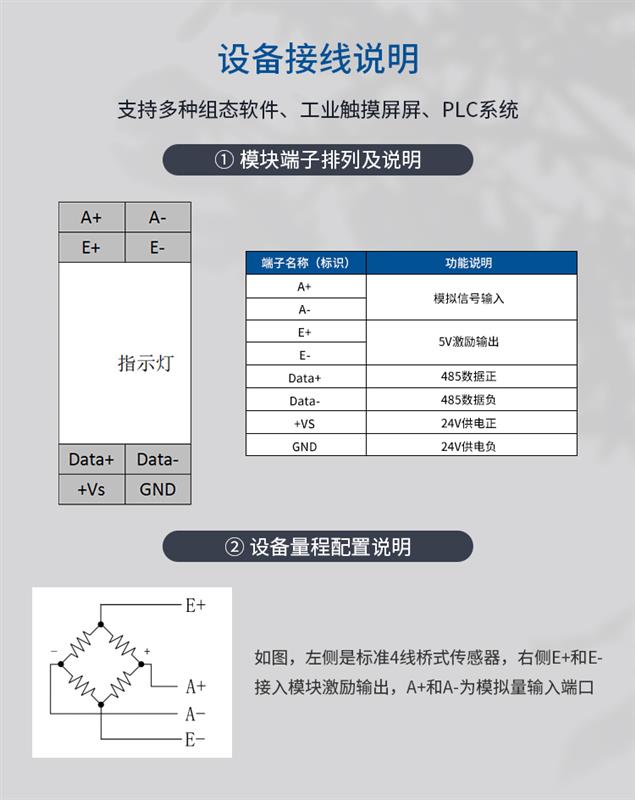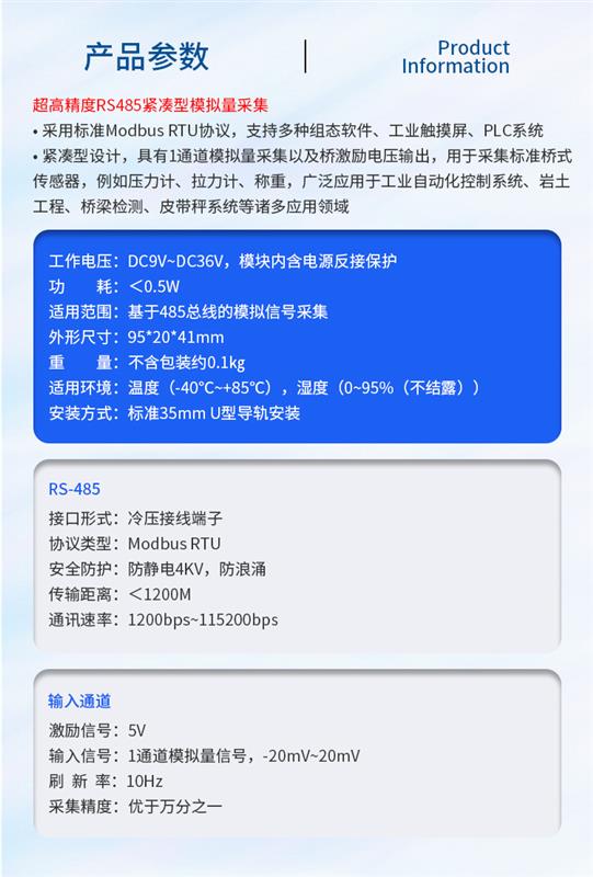 DAQM-4221 采用標(biāo)準(zhǔn) MODBUS RTU 協(xié)議,支持多種組態(tài)軟件、工業(yè)觸摸屏、PLC 系統(tǒng)。緊湊型設(shè)計(jì),具有 1 通道模擬量采集以及橋激勵(lì)電壓輸出,用于標(biāo)準(zhǔn)橋式傳感器采集,例如壓力計(jì)、拉力計(jì)、稱(chēng)重,廣泛應(yīng)用于工業(yè)自動(dòng)化控制系統(tǒng)、巖土工程、橋梁檢測(cè)、皮帶秤系統(tǒng)等諸多應(yīng)用領(lǐng)域。本產(chǎn)品工作電壓 DC24V,標(biāo)準(zhǔn)導(dǎo)軌安裝,通訊端口防靜電防浪涌設(shè)計(jì)。