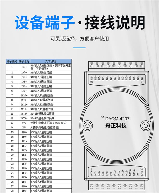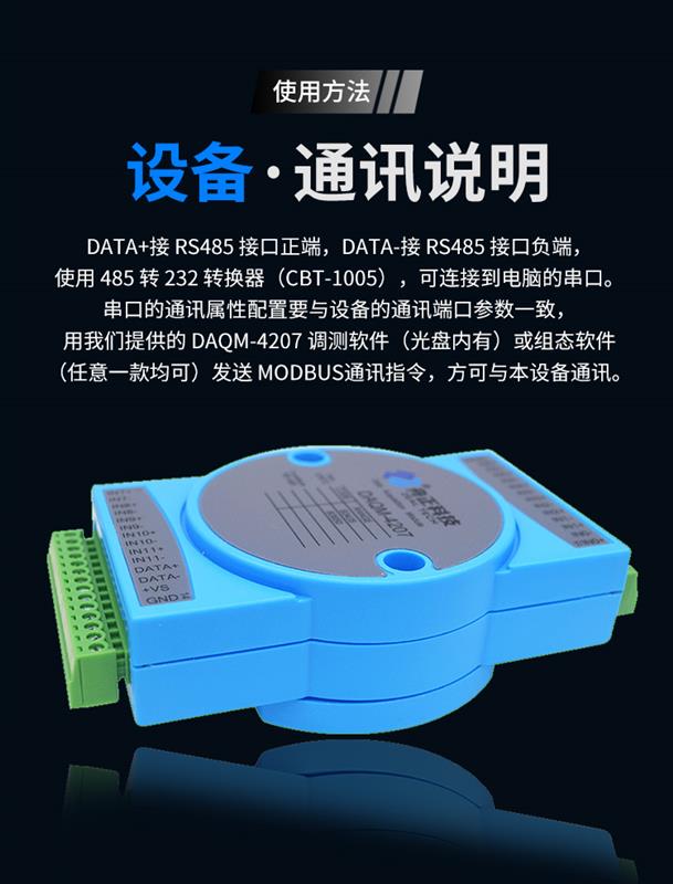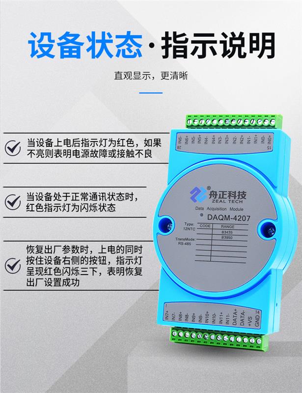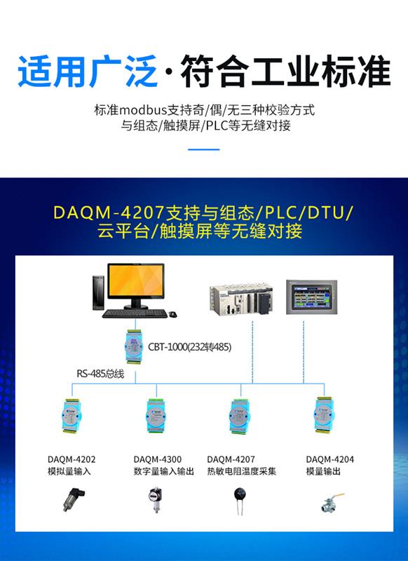 DAQM-4207 是一款 NTC 溫度采集產(chǎn)品,支持 B 值 3435 的 10K NTC 輸入,RS485 通訊接口光電隔離,應(yīng)用層采用標(biāo)準(zhǔn) MODBUS-RTU 協(xié)議,符合工業(yè)標(biāo)準(zhǔn)。方便與上位機(jī)通訊,可實(shí)現(xiàn)快速組網(wǎng),構(gòu)建監(jiān)測(cè)系統(tǒng)。