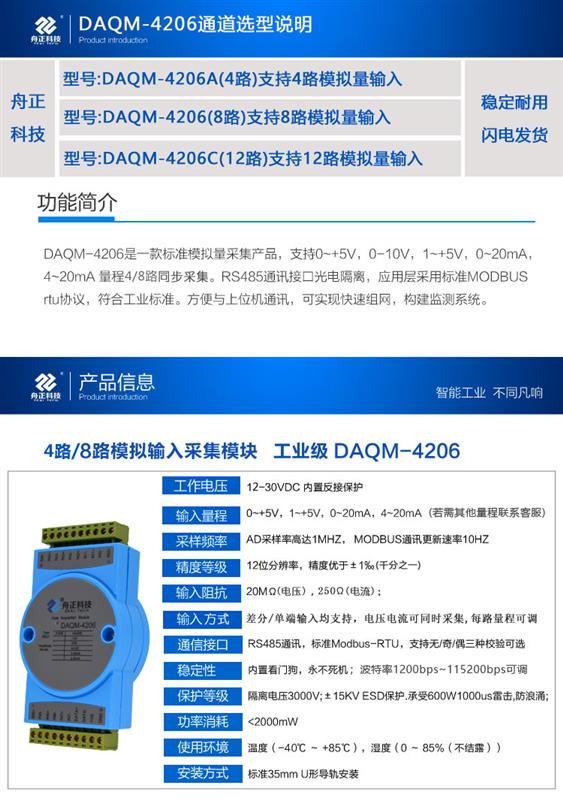 DAQM-4206 是一款標(biāo)準(zhǔn)模擬量采集產(chǎn)品,支持 0~ 5V、1~ 5V、0~20mA、4~20mA 等量程 8 通道單端或差分輸入。RS485 通訊接口光電隔離,應(yīng)用層采用標(biāo)準(zhǔn) MODBUS-RTU 協(xié)議,符合工業(yè)標(biāo)準(zhǔn)。方便與上位機(jī)通訊,可實(shí)現(xiàn)快速組網(wǎng),構(gòu)建監(jiān)測系統(tǒng)。