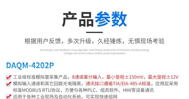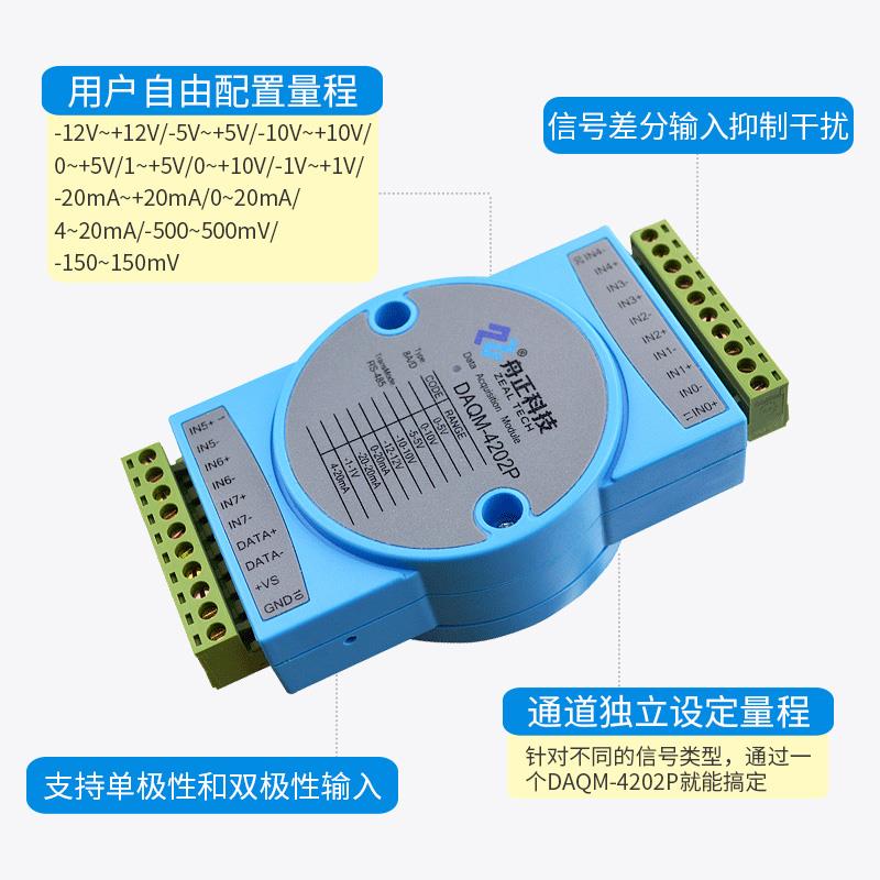 DAQM-4202P 是一款工業(yè)級標準模擬量采集產(chǎn)品,8 通道差分輸入,量程范圍?150mV至?12V,所有通道可以單獨設置量程。模擬輸入通道和其它回路光電隔離,通訊接口遵循 TIA/EIA-485-A 標準,應用層采用標準 MODBUS RTU 協(xié)議,方便與各種 PLC、組態(tài)軟件、HMI 等設備通訊,產(chǎn)品工作溫度范圍-40~85 攝氏度,適用于各種工業(yè)現(xiàn)場及自動化系統(tǒng),可實現(xiàn)快速組網(wǎng),構建基于工業(yè)現(xiàn)場總線的分布式數(shù)據(jù)采集系統(tǒng)。