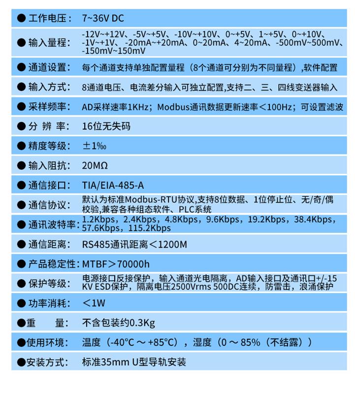 采樣頻率AD 采樣速率 1KHz;Modbus 通訊數(shù)據(jù)更新速率<;100Hz;可設置濾波