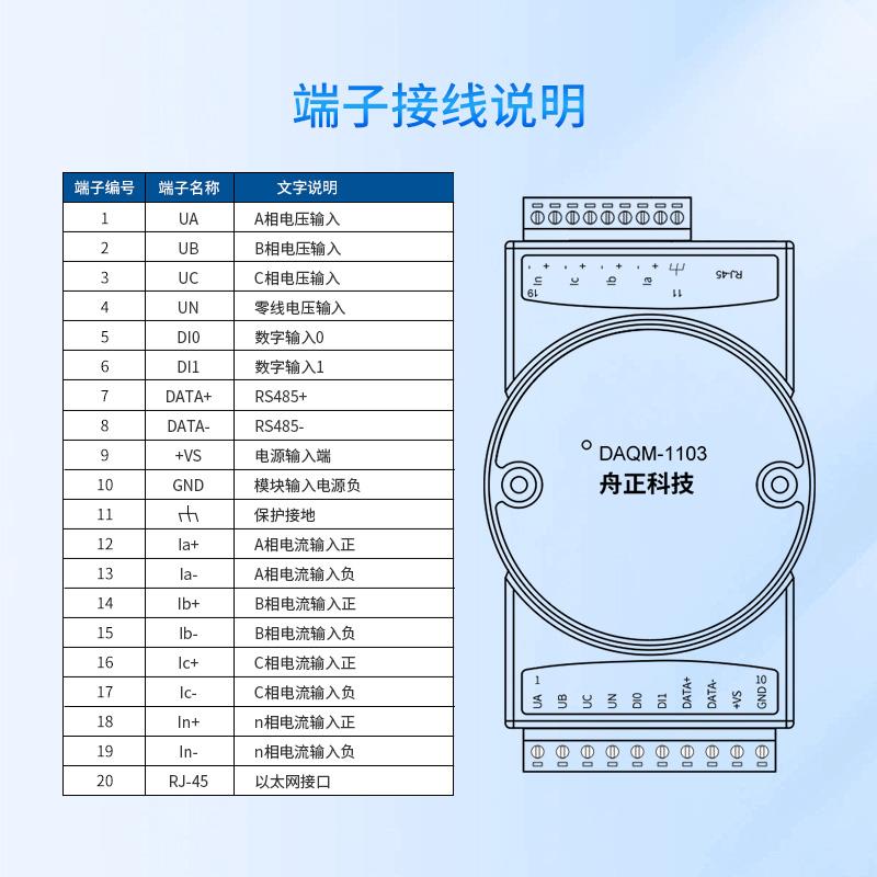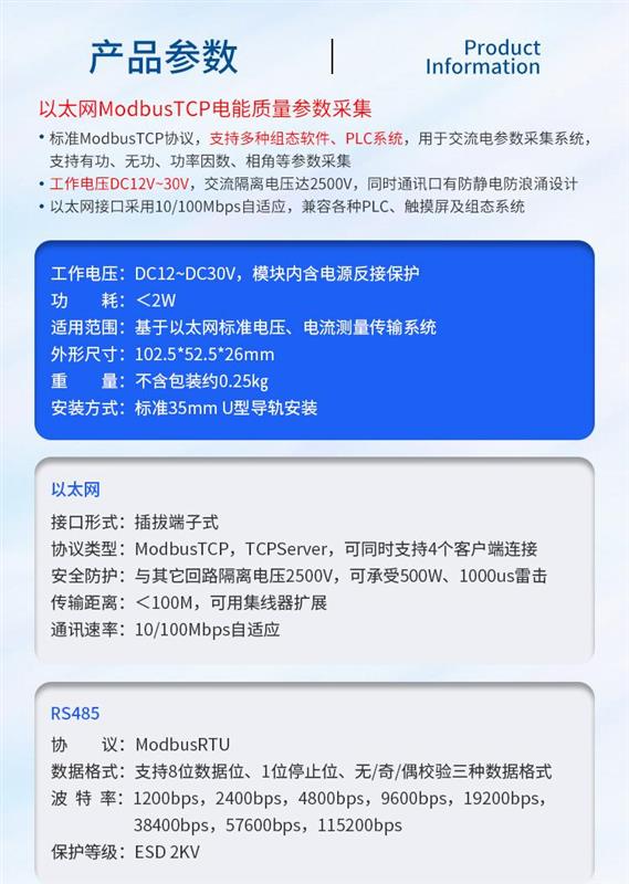 DAQM-1103 采用標(biāo)準(zhǔn) ModbusTCP 協(xié)議,支持多種組態(tài)軟件、PLC 系統(tǒng)。用于交流電參數(shù)采集系統(tǒng),支持有功、無功、功率因數(shù)、相角等參數(shù)采集。產(chǎn)品工作電壓 DC12-30V,標(biāo)準(zhǔn) 35mm 導(dǎo)軌安裝,交流隔離電壓達(dá) 2500V,同時(shí)通訊口有防靜電防浪涌設(shè)計(jì),10/100Mbps 自適應(yīng)以太網(wǎng)和 RS485雙接口設(shè)計(jì),支持 MODBUS 協(xié)議兼容各種 PLC、觸摸屏及組態(tài)系統(tǒng)。