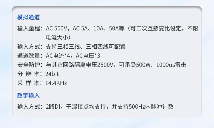 輸入量程AC 500V,AC 5A、50A、10A(支持二次互感變比設(shè)定)
