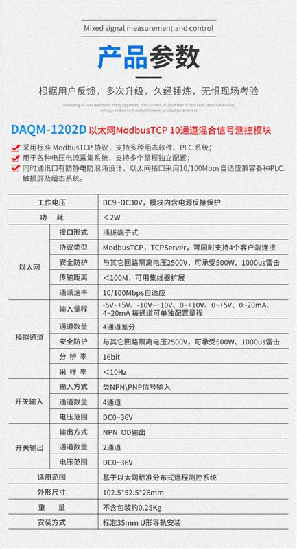 DAQM-1202D 采用標(biāo)準(zhǔn) ModbusTCP 協(xié)議,支持多種組態(tài)軟件、PLC 系統(tǒng)。用于各種電壓電流采集系統(tǒng),支持多個(gè)量程獨(dú)立配置。產(chǎn)品工作電壓 DC9-30V,標(biāo)準(zhǔn)導(dǎo)軌安裝,通訊口及模擬量通道、開(kāi)關(guān)量輸入輸出通道全部使用光電隔離,隔離電壓達(dá) 2500V,同時(shí)通訊口有防靜電防浪涌設(shè)計(jì),以太網(wǎng)接口采用 10/100Mbps 自適應(yīng)兼容各種 PLC、觸摸屏及組態(tài)系統(tǒng)。