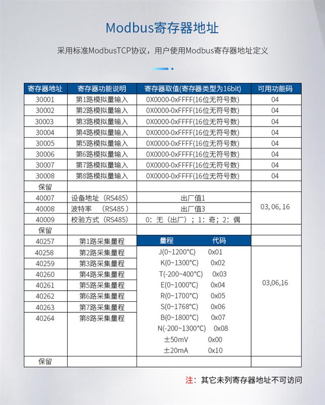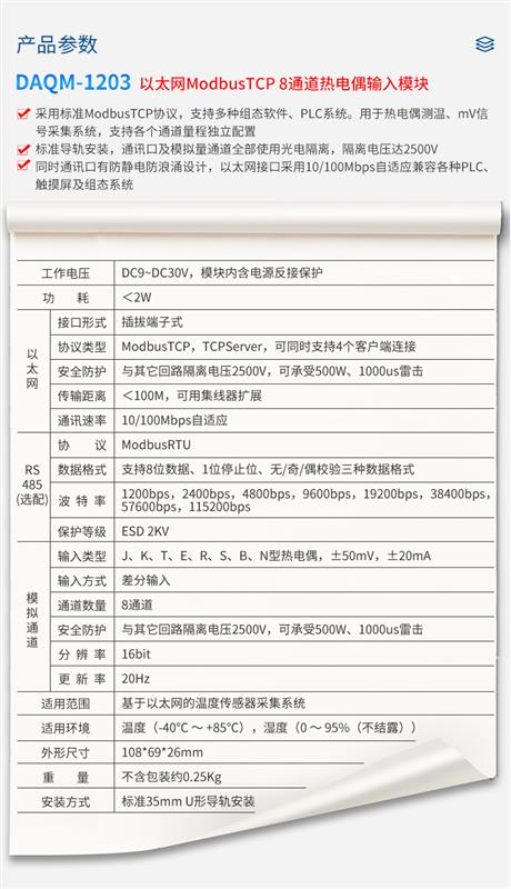 DAQM-1203 采用標(biāo)準(zhǔn) ModbusTCP 協(xié)議,支持多種組態(tài)軟件、PLC 系統(tǒng)。用于熱電偶測(cè)溫、mV信號(hào)采集系統(tǒng),支持各個(gè)通道量程獨(dú)立配置。支持 DC9-30V 寬工作電壓,標(biāo)準(zhǔn)導(dǎo)軌安裝,通訊口及模擬量通道全部使用光電隔離,隔離電壓達(dá) 2500V,同時(shí)通訊口有防靜電防浪涌設(shè)計(jì),以太網(wǎng)接口采用 10/100Mbps 自適應(yīng)兼容各種 PLC、觸摸屏及組態(tài)系統(tǒng)。