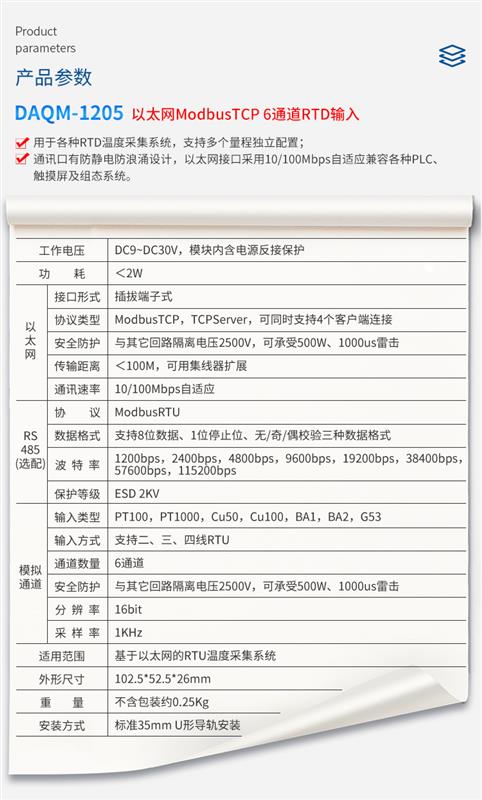 DAQM-1205 采用標(biāo)準(zhǔn) ModbusTCP 協(xié)議,支持多種組態(tài)軟件、PLC 系統(tǒng)。用于各種 RTD 溫度采集系統(tǒng),支持多個(gè)量程獨(dú)立配置。產(chǎn)品工作電壓 DC9-30V,標(biāo)準(zhǔn)導(dǎo)軌安裝,通訊口及模擬量通道全部使用光電隔離,隔離電壓達(dá) 2500V,同時(shí)通訊口有防靜電防浪涌設(shè)計(jì),以太網(wǎng)接口采用10/100Mbps 自適應(yīng)兼容各種 PLC、觸摸屏及組態(tài)系統(tǒng)。