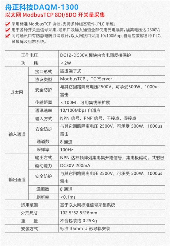 DAQM-1300 采用標(biāo)準(zhǔn) ModbusTCP 協(xié)議,支持多種組態(tài)軟件、PLC 系統(tǒng)。用于各種開(kāi)關(guān)量信號(hào)采集。產(chǎn)品工作電壓 DC9-36V,標(biāo)準(zhǔn) 35mm U 型導(dǎo)軌安裝,通訊口及輸入通道全部使用光電隔離,隔離電壓達(dá) 2500V,同時(shí)通訊口有防靜電防浪涌設(shè)計(jì),以太網(wǎng)接口采用 10/100Mbps 自適應(yīng)兼容各種PLC、觸摸屏及組態(tài)系統(tǒng)。