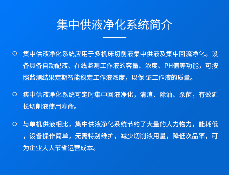 與單機(jī)循環(huán)系統(tǒng)相比,集中過(guò)濾的優(yōu)越性表現(xiàn)在這幾個(gè)方面:切削液使用集中供液凈化裝置,可以集中把切削液進(jìn)行過(guò)濾再生,利用半導(dǎo)體無(wú)機(jī)膜處理后的切削液再生率在90%左右,去掉切削液里面的金屬碎屑和其他雜油質(zhì)量的東西,延長(zhǎng)切削液的使用壽命。過(guò)濾后的切削液可以循環(huán)使用,減低使用切削液的成本,同時(shí)節(jié)約資源,保護(hù)環(huán)境,話不多說(shuō),直接看圖。
