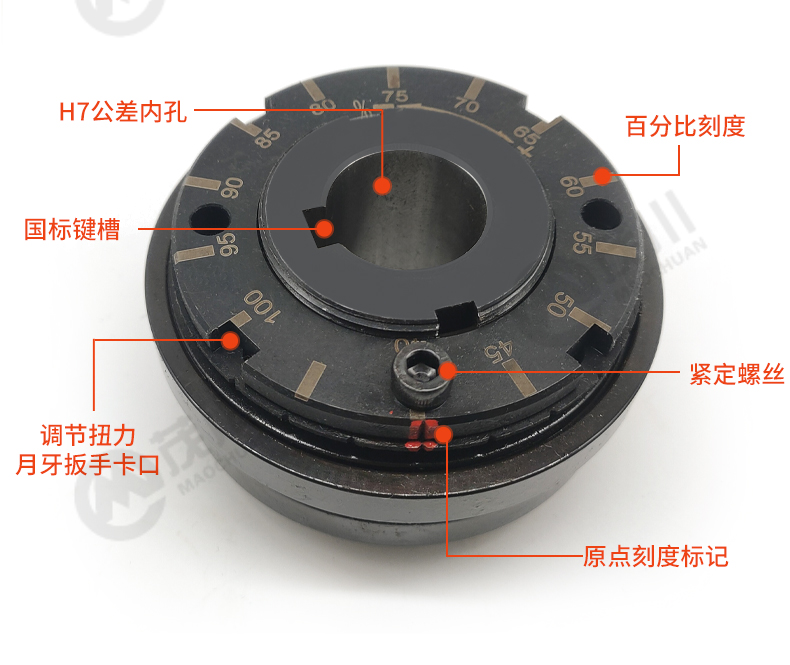 產(chǎn)品說(shuō)明:當(dāng)設(shè)備傳遞力矩超過(guò)設(shè)定的打滑力矩(過(guò)載)時(shí),鋼球離開凹坑,使主動(dòng)端部件和從動(dòng)端部件之間產(chǎn)生打滑,此時(shí)傳遞的力矩降低到很小,同時(shí)發(fā)訊環(huán)產(chǎn)生軸向位移,觸動(dòng)傳感器或位移開關(guān),使傳感器輸出信號(hào),隨之可用輸出的信號(hào)來(lái)控制操作或切斷動(dòng)力源,使設(shè)備停止轉(zhuǎn)動(dòng),起到保護(hù)設(shè)備的作用。