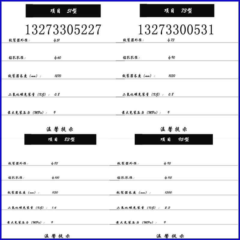 二氧化-碳設108型號每根爆-破管可充裝二氧化-碳氣體7公斤,爆-破后可生產(chǎn)60--80方碎石,而且根本無需二次破碎,整體成本核算下來每方成本是1元左右,每天的開方量輕松達到6000方,無振動、無飛石、無需二次破碎、無須致裂公司、無需報備、審批!關鍵是省錢 ?。?!這“五無”、“一省” 無須多做解釋,也是您開礦、施工的好選擇!
