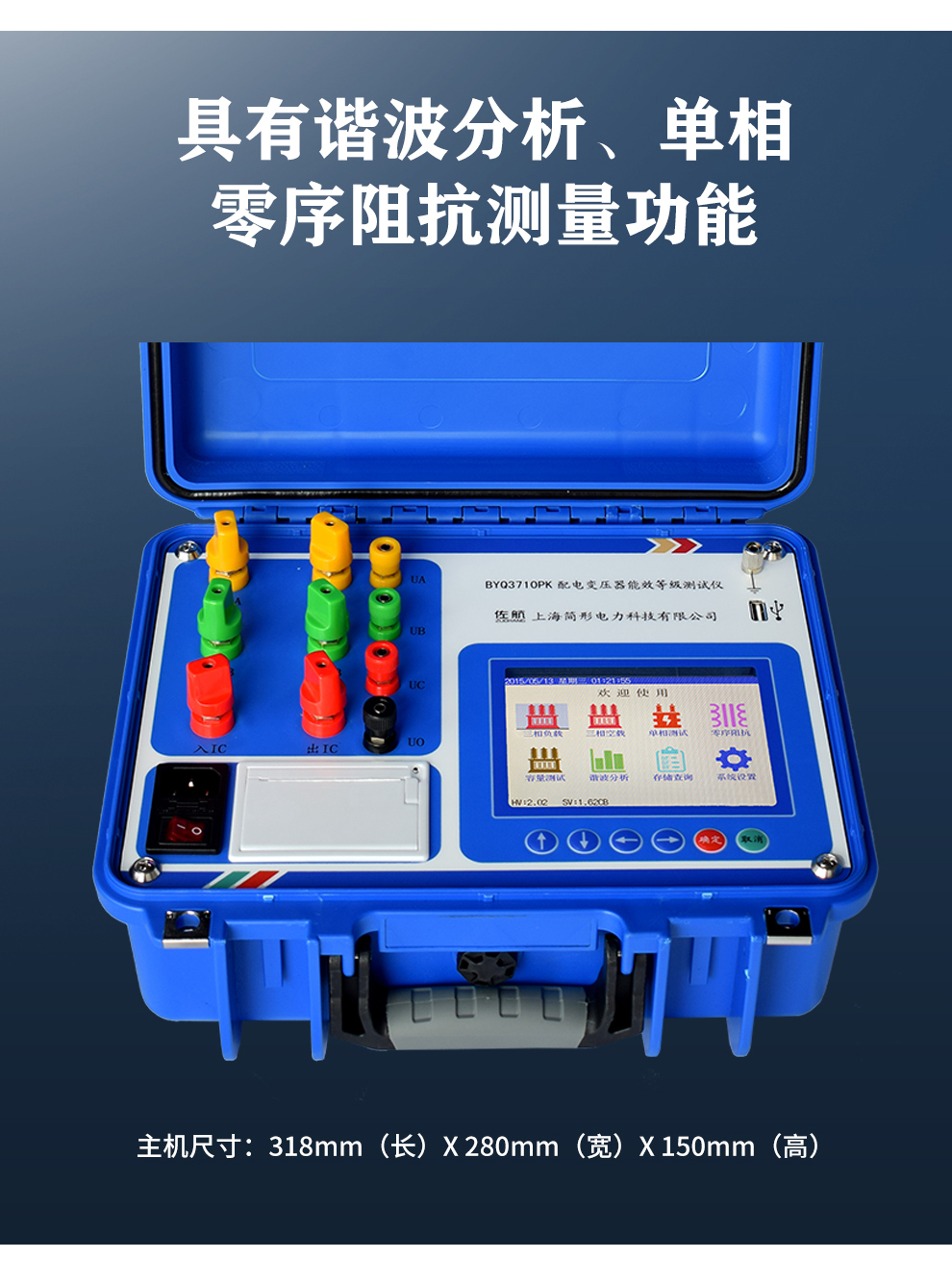 顯示三相電壓、三相電流、三相功率,自動(dòng)計(jì)算出變壓器的阻抗電壓百分比,折算到額定溫度、額定電流下的負(fù)載損耗,自動(dòng)判斷出油浸式或干式配電變壓器的鐵芯型號,測試過程中具有報(bào)警自適應(yīng)提示功能,方便現(xiàn)場用戶使用。