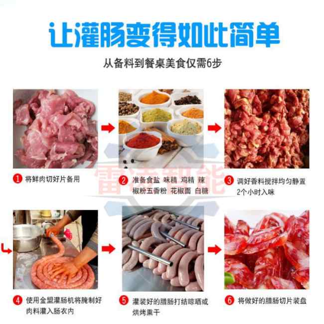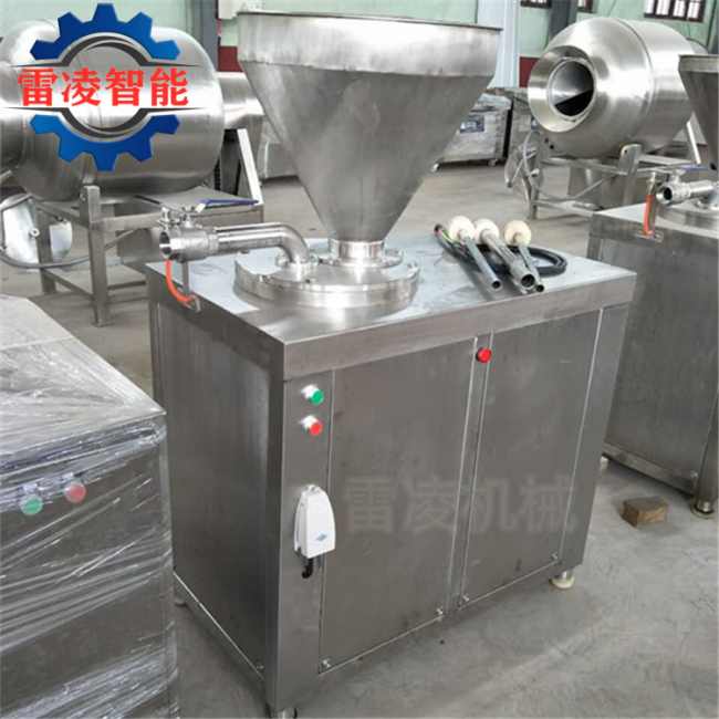 本系列灌腸機(jī)(食品加工機(jī)械廠家Tel:150*5447-0262)可灌制各種腸類如火腿腸、肉泥腸、大眾腸、紅腸、菜腸、粉腸及松江腸等。主要的原料,經(jīng)過脂制(或未經(jīng)脂制),絞碎或者是暫化成肉糜狀并混合,以畜禽肉為種原料,用灌填入腸衣或人造腸衣中成型,后可進(jìn)行熏蒸加工。該機(jī)適用于動(dòng)物腸衣、蛋白腸衣、塑料腸衣的灌制。