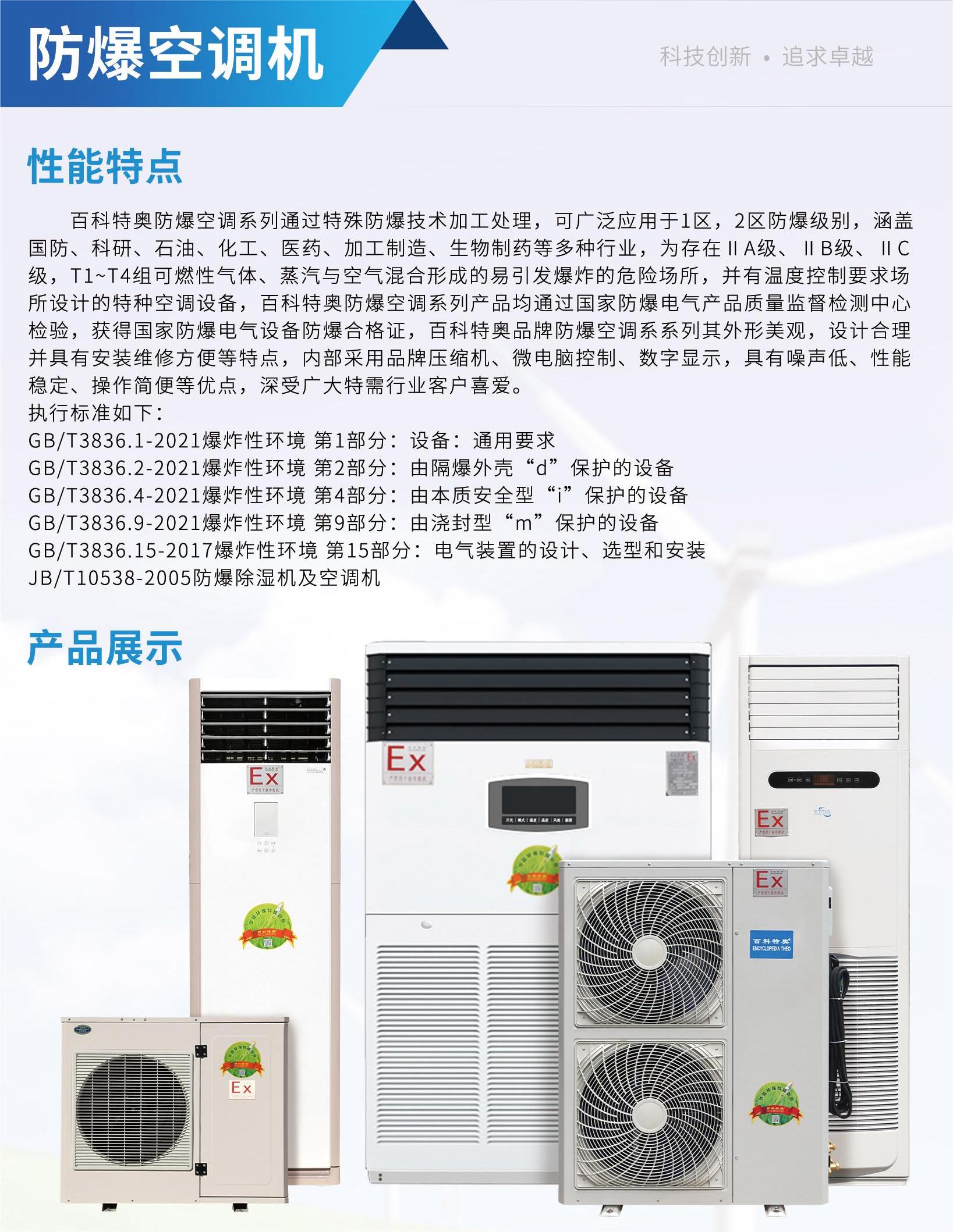 百科特奧1匹防爆空調(diào) 化工倉庫防爆空調(diào)BFKT-2.6。以免在維修時造成錯誤判斷而造成短路。檢查之后如果效果還不好,可進一步測量電流和系統(tǒng)工作壓力來判斷。首先由監(jiān)聽表來測量空調(diào)的運行電流,如果電流小于標(biāo)準電流,說明是管路系統(tǒng)缺少制冷劑,在加入制冷劑前,必須找出缺少制冷劑的原因。如果檢測的運行電流明顯偏大,需進一步測量系統(tǒng)的運行壓力來判斷故障部位。假如壓力偏小,說明系統(tǒng)有輕微堵塞的地方。加入壓力偏大,會認為外籍散熱不好或者充入制冷劑過多。如果測得的空調(diào)運行電流正常,還可通過測量系統(tǒng)壓力進行判斷。如果壓力偏小,說明洗頭呢微賭。如果壓力正常,可以進一步觀察動作來進行故障劃分。