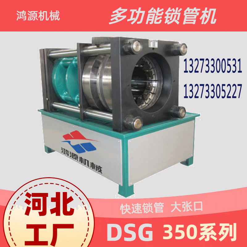 本機(jī)為DSG—350型內(nèi)脹外壓機(jī),是生產(chǎn)復(fù)合管總成扣壓所用的高壓大口徑復(fù)合管管頭與外套、芯子壓合在一起的專用設(shè)備。該設(shè)備是根據(jù)用戶現(xiàn)場實(shí)際應(yīng)用經(jīng)驗(yàn)而開發(fā)的,在用戶以往的膠管總成扣壓經(jīng)驗(yàn)當(dāng)中,用戶把膠管總成扣壓完成之后試壓完成,膠管總成不發(fā)生泄漏即合格,但是在實(shí)際當(dāng)中,膠管總成扣壓完之后,膠管外層的鐵皮套筒與膠管外圓結(jié)合緊密,而且套筒內(nèi)壁的防滑溝槽由于扣壓后產(chǎn)生永久性形變而嵌入到膠管的外膠層里,但由于膠管有彈性,且彈性變形量大,所以膠管內(nèi)芯的防滑溝槽與膠管內(nèi)壁之間結(jié)合并不緊密,經(jīng)長時(shí)間使用,尤其是管道內(nèi)輸送流體的壓力高低往復(fù)變化時(shí),更容易造成膠管與內(nèi)芯松動(dòng),從而使管路發(fā)生泄漏,基于這種使用情況,特開發(fā)本設(shè)備,在扣壓完膠管外套筒之后,再通過膠管內(nèi)芯脹模使內(nèi)芯脹到所需尺寸,從而使膠管內(nèi)芯與膠管內(nèi)壁緊密結(jié)合,有效防止膠管總成發(fā)生泄漏