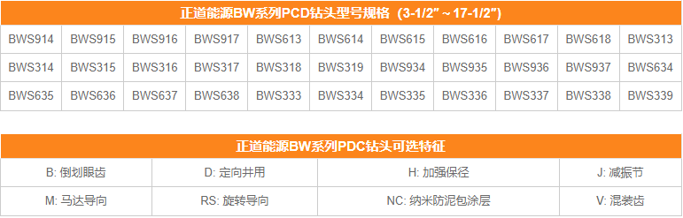 正道能源金剛石PDC鉆頭型號尺寸覆蓋3-1/2″~17-1/2″,包括:3-1/2″(3.5寸),6-1/2″(6.5寸),8-1/2″(8.5寸),12-1/4″(12.25寸),17-1/2″(17.5寸)等,鉆頭類型包括:PDC取芯鉆頭;PDC雙心鉆頭;PDC劃眼器等,鉆頭刀翼設計包括5-8片直刀翼和螺旋刀翼等,PDC鉆頭型號標準BWS系列覆蓋常用鉆頭參數(shù)。