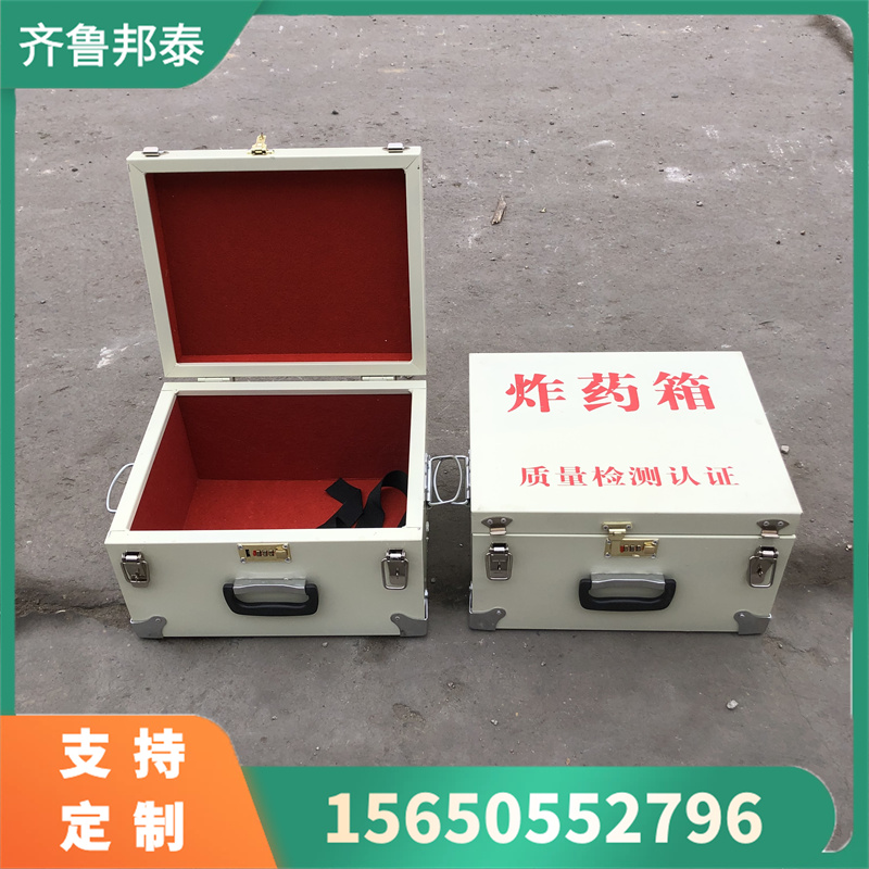 防爆箱箱體外置1mm厚防爆鋼板,內(nèi)置7mm絕緣木板以及2mm抗震阻燃防靜電氈。防爆箱鎖具配有三位防盜機(jī)械密碼鎖與兩個(gè)不銹鋼明鎖扣,是標(biāo)準(zhǔn)雙鎖配置,符合GA檢測(cè)標(biāo)準(zhǔn)。同時(shí)箱體四角嵌有不銹鋼防撞包角,確保箱體更加堅(jiān)固、抗撞擊。防爆箱配有提手并加裝聚氨酯背帶以便爆破員實(shí)現(xiàn)手提、肩背,便于其更加高效工作。