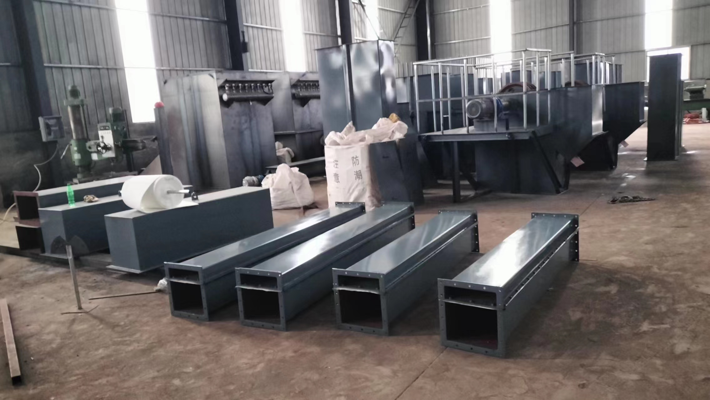 薄鋼板制成的槽體聯(lián)接組成并沿其輸送的方向布置成一定的斜度。槽體由上、下槽體以及上、下槽體中間夾著的透氣層組成。被輸送物料由高端喂入上槽體,空氣由鼓風機吹入下槽體并通過透氣層分布在物體顆粒之間,使其形成流動狀態(tài)(即流態(tài)化),沿斜度下滑達到輸送的目的。充氣槽是由透氣層和下槽體組成的槽體,一般用于庫內均化或出料。
