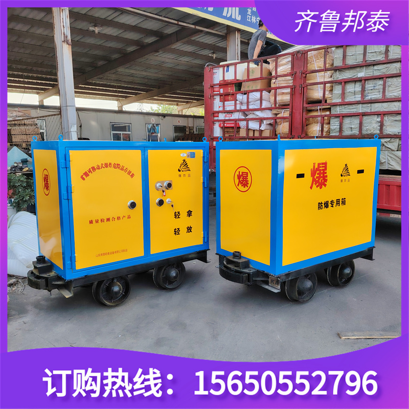 山東邦泰集團針對各類礦山井下研發(fā)生產(chǎn)的一款專門放置導爆管,電雷管,炸藥,爆破火工品等爆炸物品器材的儲運柜,全稱為“礦用有軌爆炸物品運輸車”。