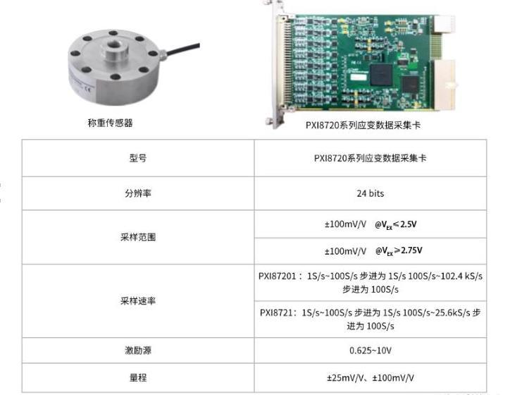 數(shù)據(jù)采集卡選擇:PXI8720系列應(yīng)變數(shù)據(jù)采集卡:該系列卡專為應(yīng)變片類型的傳感器設(shè)計(jì),自帶激勵(lì)源(0.625~10V),擁有24位分辨率以及 . 25mV/V、 . 100mV/V量程能夠精準(zhǔn)采集重量變化對(duì)應(yīng)的電信號(hào),廣泛應(yīng)用于稱重傳感器的測(cè)量和數(shù)據(jù)采集。