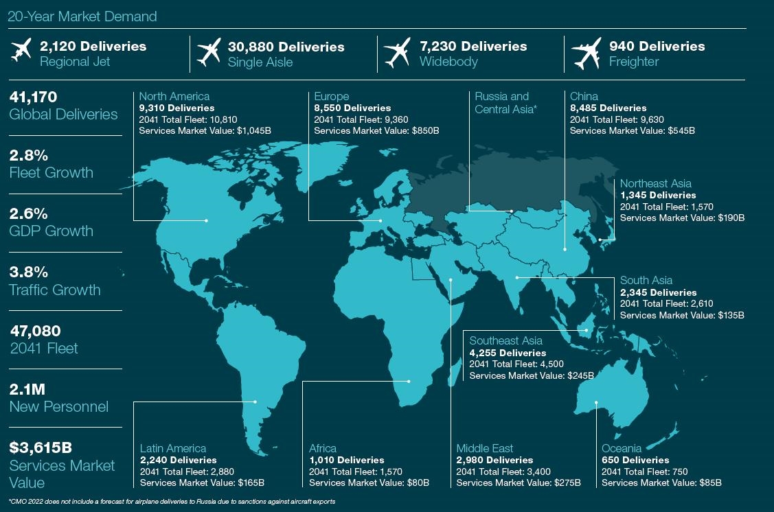 CMO預測到2041年全球將會有41170架飛機交付,將會有2120架支線飛機交付、30880架單通道飛機交付、7230架寬體飛機交付、940架貨運飛機交付;