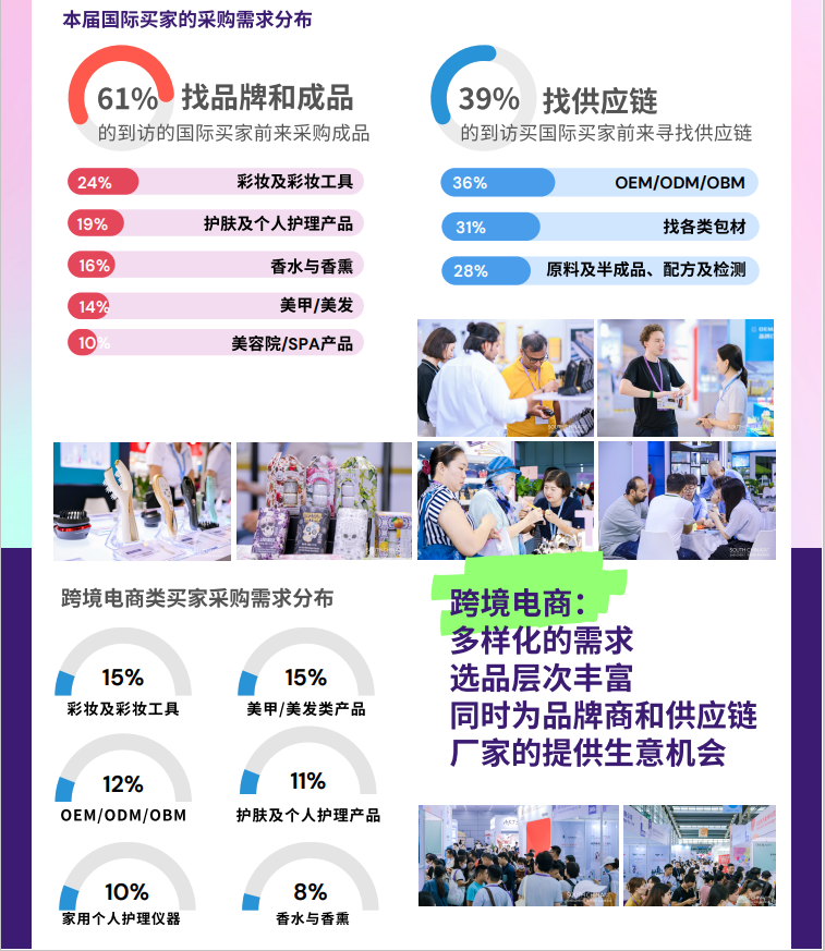 華南國(guó)際美博會(huì)堅(jiān)持打造集“消費(fèi) 科技 時(shí)尚”屬性的美妝行業(yè)盛會(huì),集美妝創(chuàng)新品牌、健康科技、生產(chǎn)供應(yīng)鏈、產(chǎn)品設(shè)計(jì)、貿(mào)易于一體的行業(yè)盛會(huì)。從概念到應(yīng)用,從產(chǎn)品到品牌,連接消費(fèi)產(chǎn)業(yè)價(jià)值鏈,打造美妝日化消費(fèi)生態(tài)圈,開(kāi)啟未來(lái)美妝新想像。